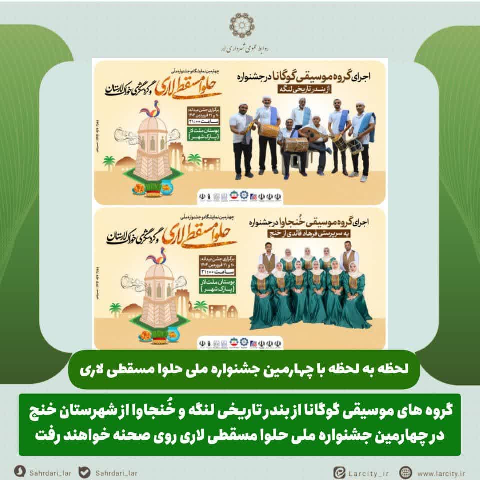 به گزارش طنین فارس و به نقل از روابط عمومی شهرداری لار، گروه های موسیقی گوگانا از بندر تاریخی لنگه و خُنجاوا از شهرستان خنج در چهارمین جشنواره ملی حلوا مسقطی لاری روی صحنه خواهند رفت.